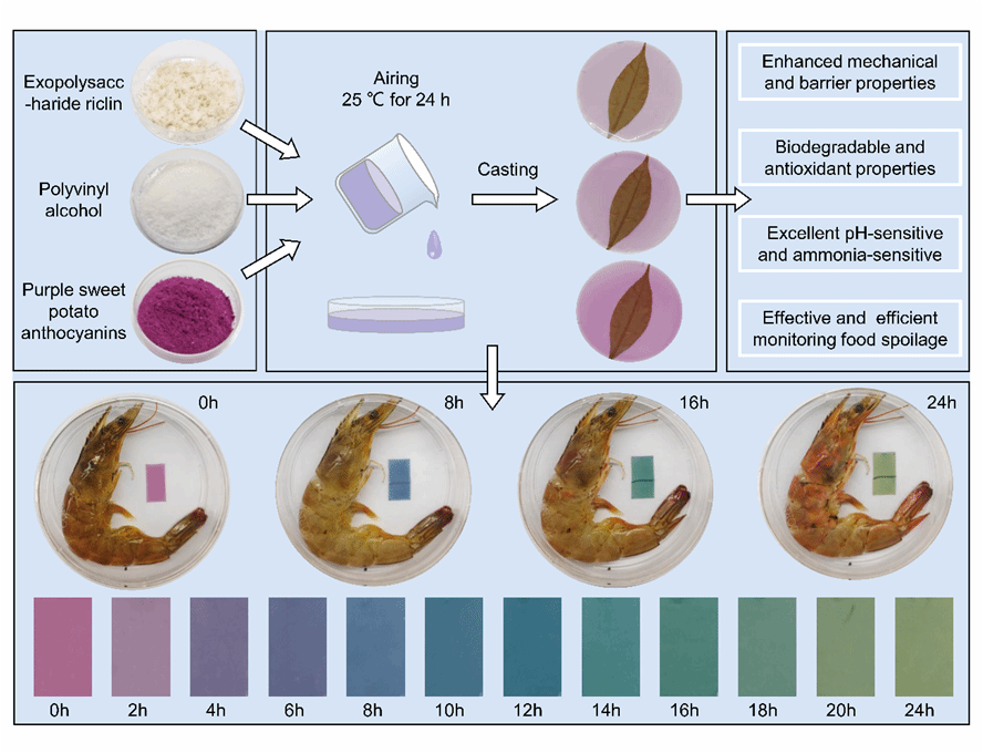 基于此,我校基础医学院孙琪博士团队聚焦于该领域研究,在《Carbohydrate Polymers》(中科院1区,TOP期刊,IF=11.2)杂志上发表题为“Exopolysaccharide riclin and anthocyanin-based composite colorimetric indicator film for food freshness monitoring”的最新研究成果。